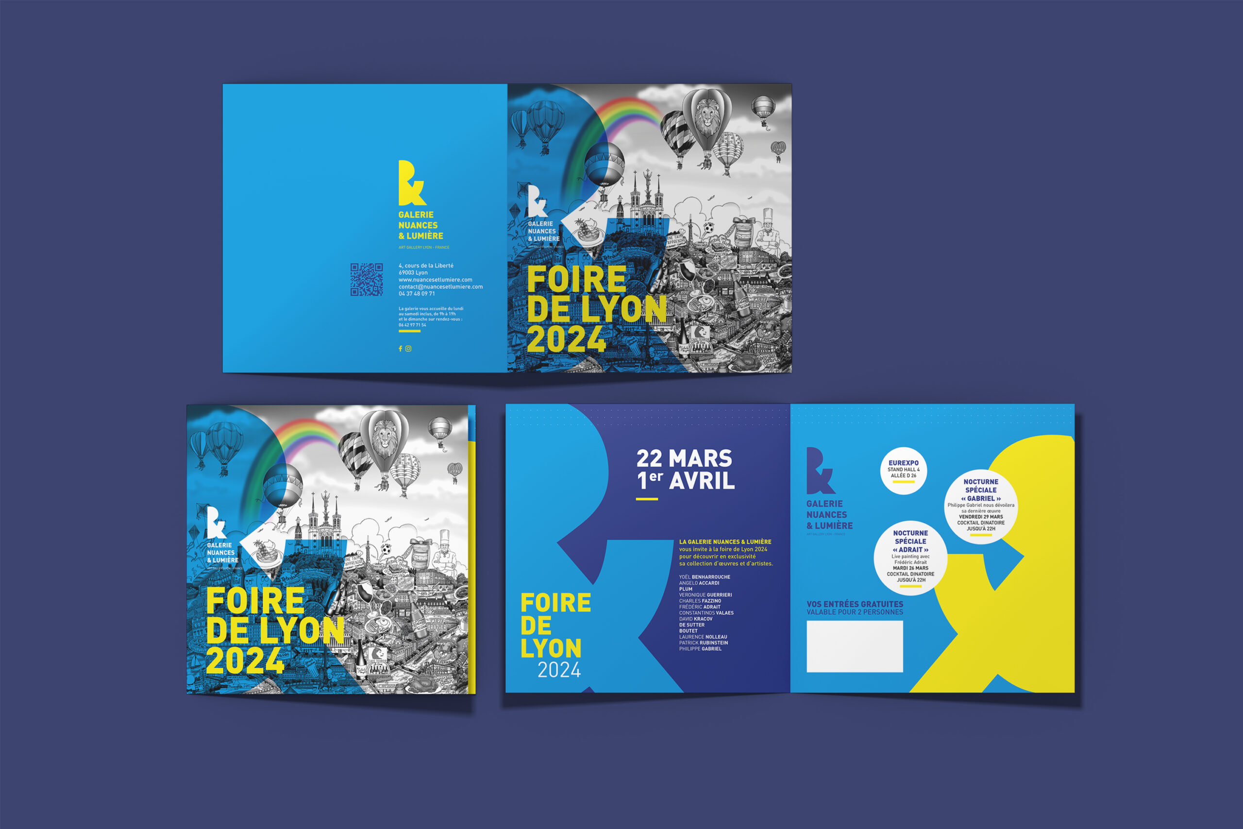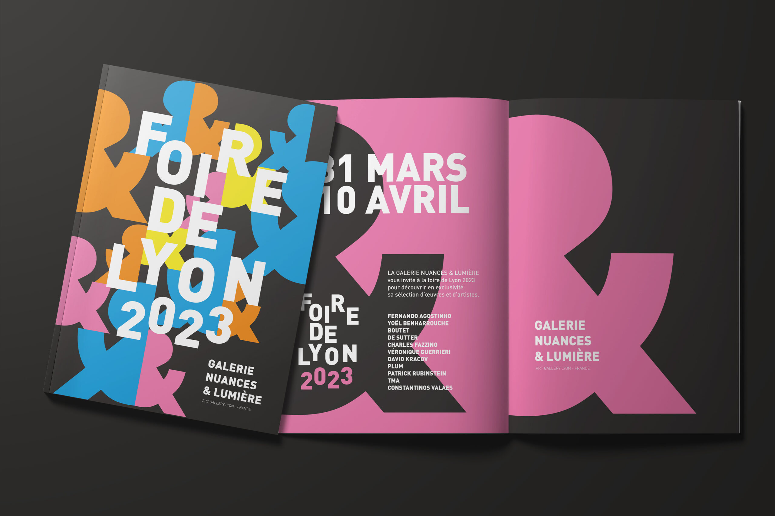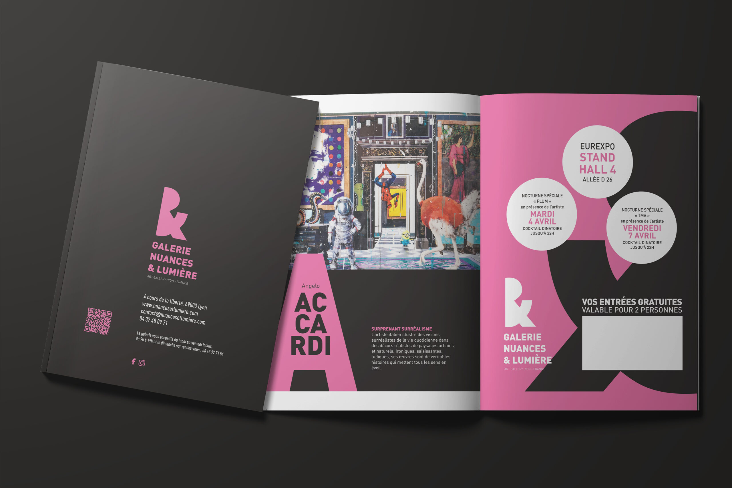 Pour informer de sa présence sur la Foire de Lyon, La Galerie Nuances et Lumière nous demande de créer un catalogue au format original, que ses clients recevront par la Poste. La galerie profite de cet outil pour susciter l’intérêt des lecteurs en dévoilant les oeuvres exposées et en les invitant au vernissage et aux différentes soirées organisées durant l’événement.