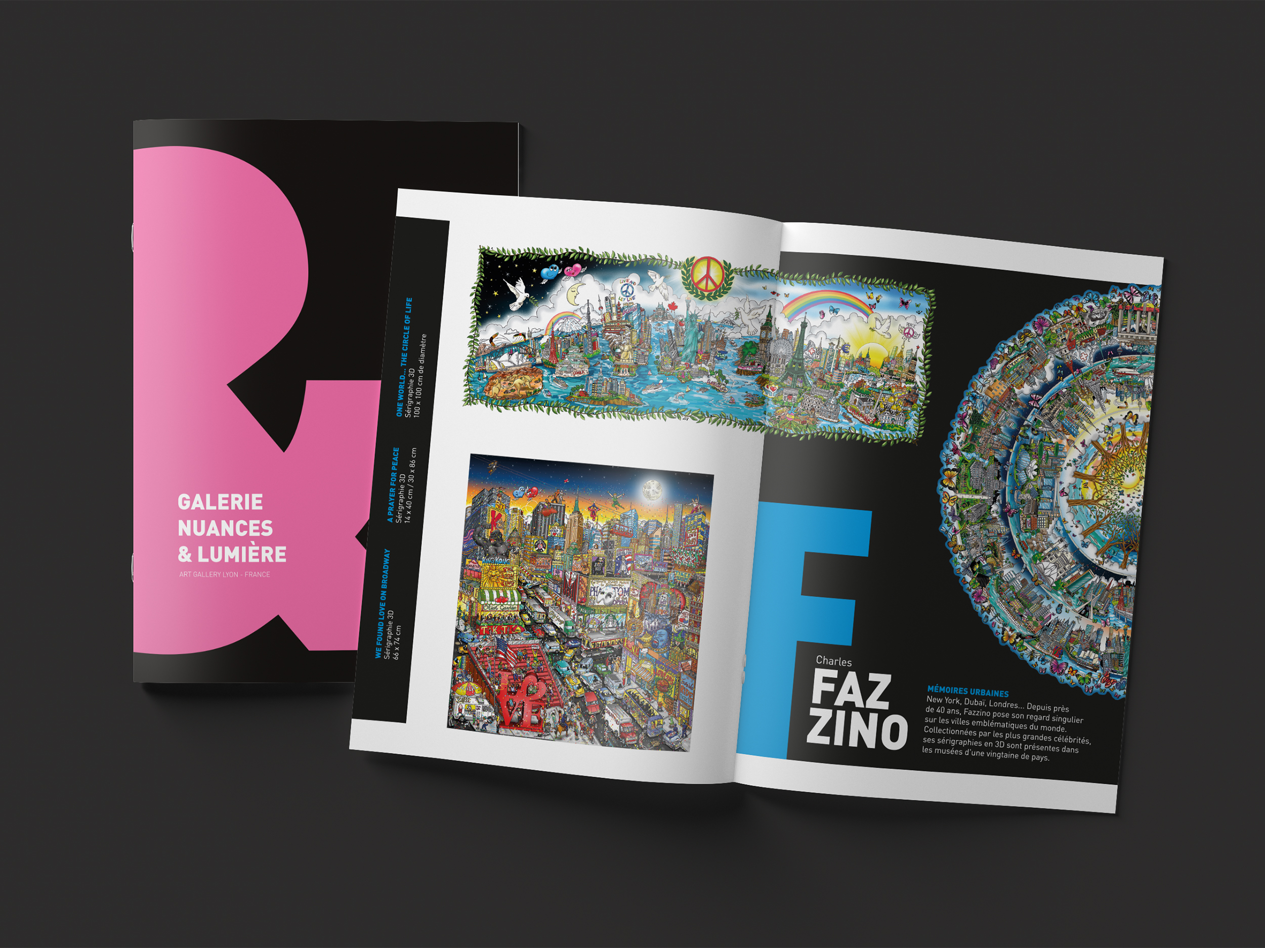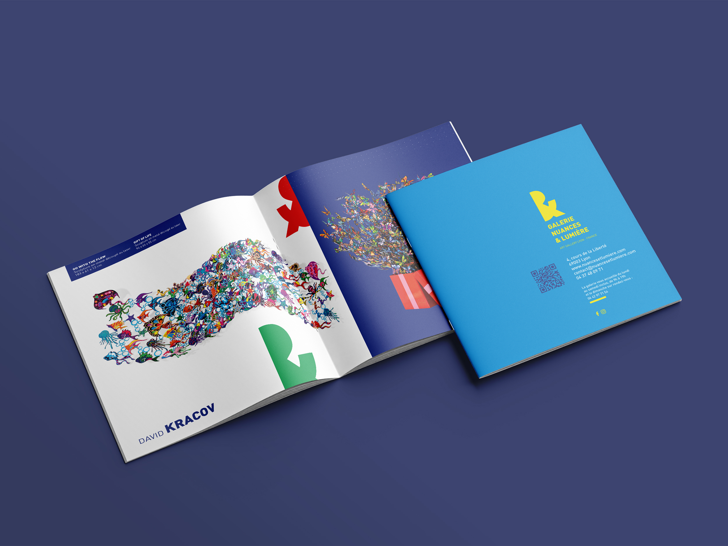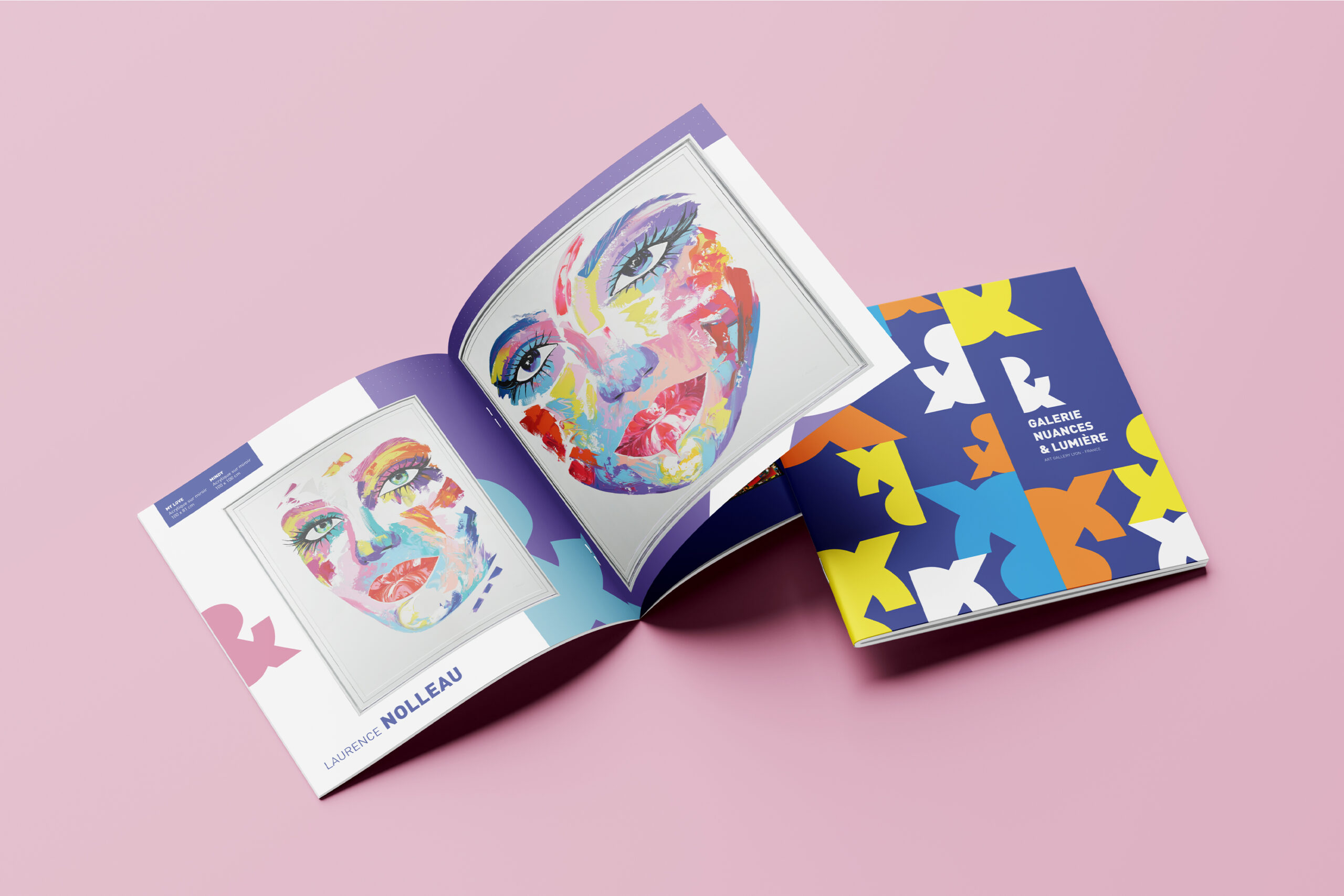 Pour informer de sa présence sur la Foire de Lyon, La Galerie Nuances et Lumière nous demande de créer un catalogue au format original, que ses clients recevront par la Poste. La galerie profite de cet outil pour susciter l’intérêt des lecteurs en dévoilant les oeuvres exposées et en les invitant au vernissage et aux différentes soirées organisées durant l’événement.
